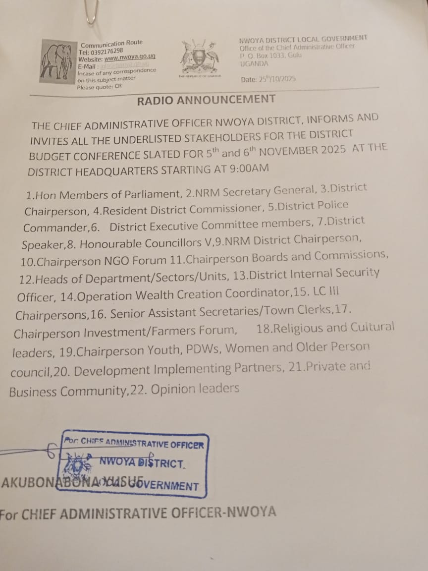 The Nwoya District Budget Conference will take place on 6th and 7th November 2025. see the attached document for the list of invited participants